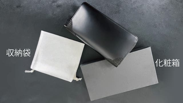 お財布を収納袋に入れて、それを化粧箱に収納して発送致します。