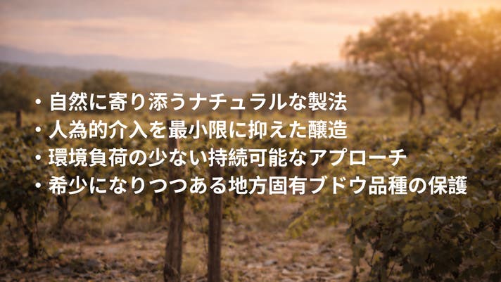 - 伝統と土地の個性を尊重。希少な地方固有ブドウを保護し、テロワールをまっすぐに表現。