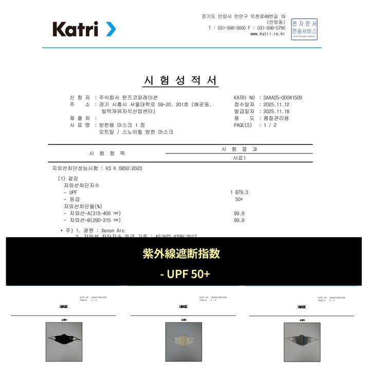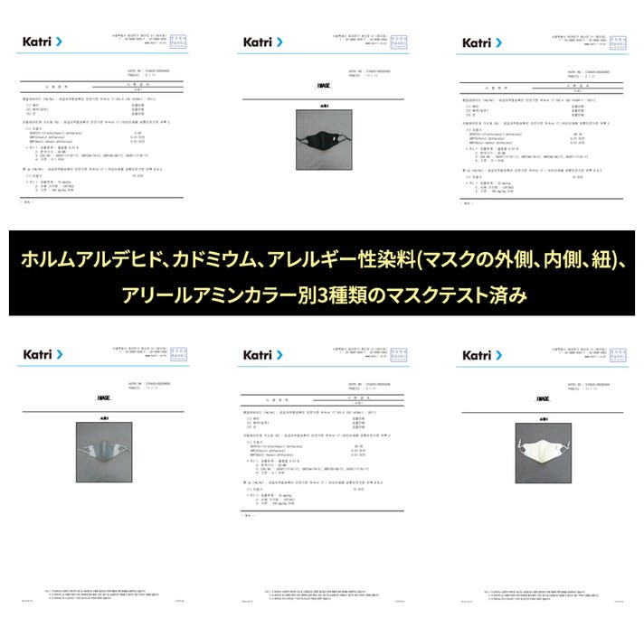 ホルムアルデヒド、カドミウム、染料(マスクの外部、内部、紐)、アリールアミン検出テストとブラック、グレー、オートミールそれぞれのカラーを全てテスト完了し、基準値未満が検出されて適合性を確認しました。