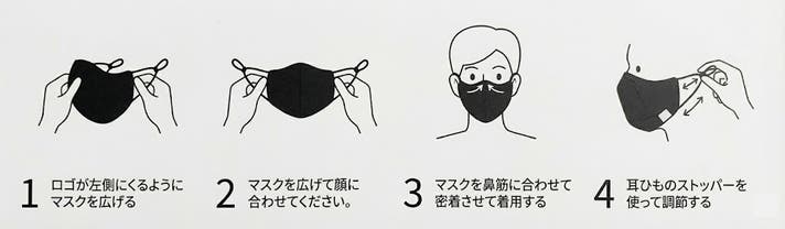 STEP 01 ロゴを確認して広げる ロゴのタグが「左側(向かって右)」にくるようにして、マスクを広げます。