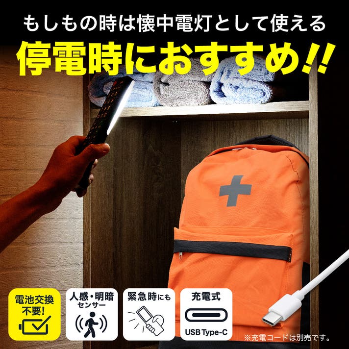 - 停電の暗闇でもセンサーが人を感知。リモコン自体が非常灯となり、すぐに明かりを確保します。