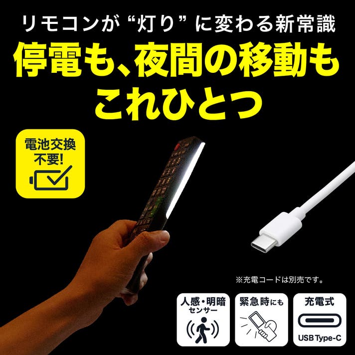 普段はリビングでくつろぎながらテレビを操作する便利なリモコンが、暗闇ではあなたの頼れるパートナーに変わります。USB充電式で主要テレビメーカー(14メーカー)に対応。日常の快適さと非常時の備えを両立した、一家に一台あると心強いアイテムです。