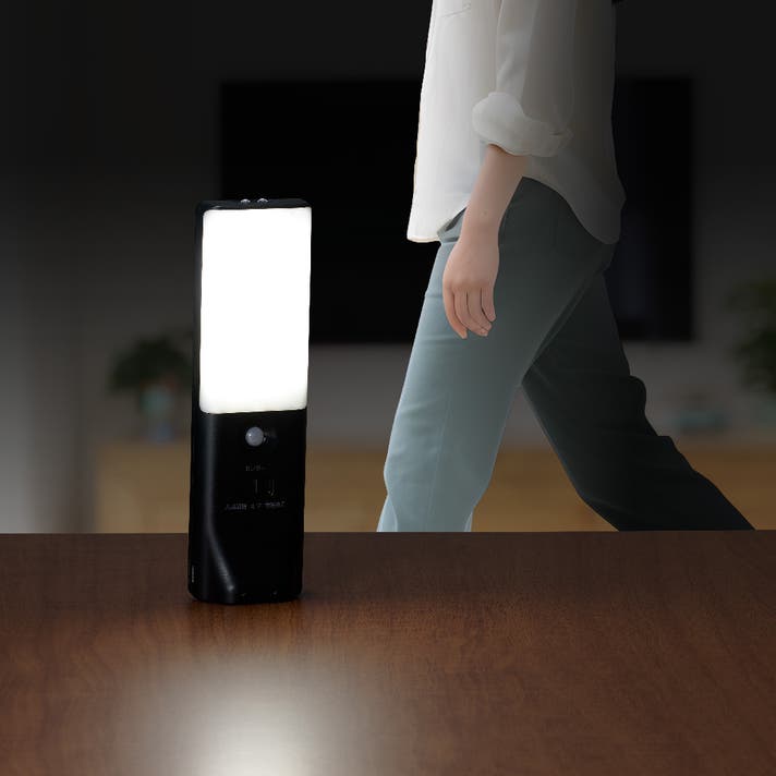 使い方: リビングのテーブルなど、いつもの場所に立てておくだけ。周囲が暗いときに人の動きを感知すると、自動で約20秒間点灯します。夜中にトイレに立つ時や、暗い部屋でリモコンを探す時に足元を優しく照らしてくれてとても便利です。