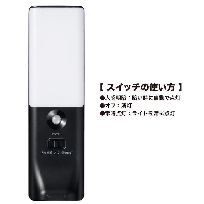 「人感明暗」モード:周囲が暗いときに人の動きを検知すると、約20秒間自動で点灯します。「常時点灯」モード:スイッチを切り替えるまで、懐中電灯のようにライトが点灯し続けます。「オフ」モード:ライト機能が不要な場合に設定します。