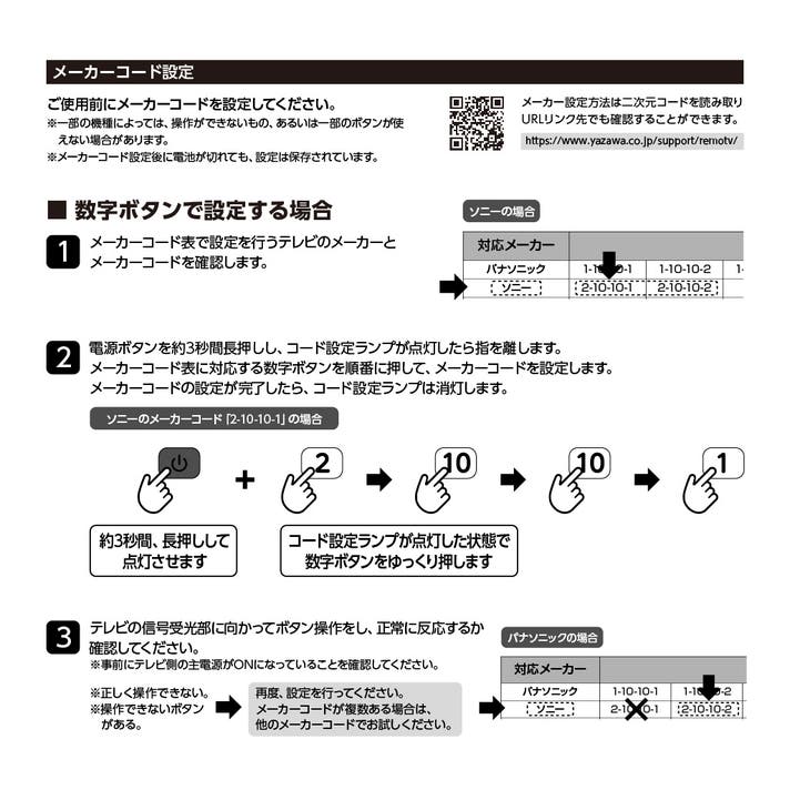 A1. 国内の主要テレビメーカー14社に対応しています。ご使用のテレビメーカーのコードを設定するだけで、すぐにお使いいただけます。