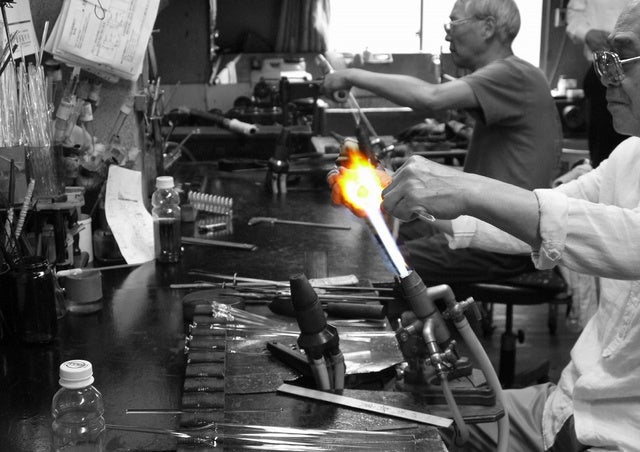 理化学ガラス職人は耐熱ガラス(硼珪酸ガラス)をバーナーで加工していろいろな形にすることができ、お客様の研究に合わせてカスタマイズいたします。その理化学ガラス職人の世界は現役80歳の方がいたり、若手で60歳くらいだったりと高齢化が進み家業としての事業継承が難しくなっている現状があります。