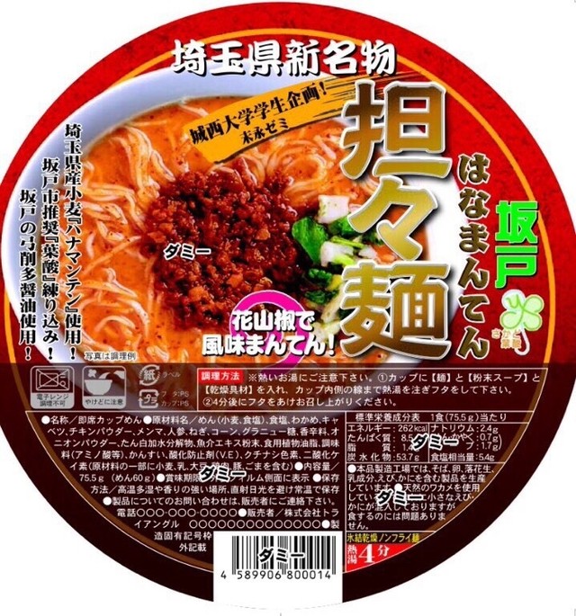 坂戸担々カップ麺の麺には坂戸市で栽培されている小麦”ハナマンテン”を使用し、スープには坂戸市に本社・工場がある”弓削多醤油”を使用。さらに坂戸市役所が推している”葉酸”も使用するなどして主要材料を坂戸さんにこだわって作っています!