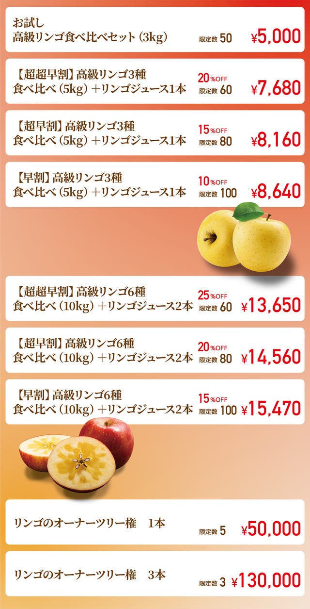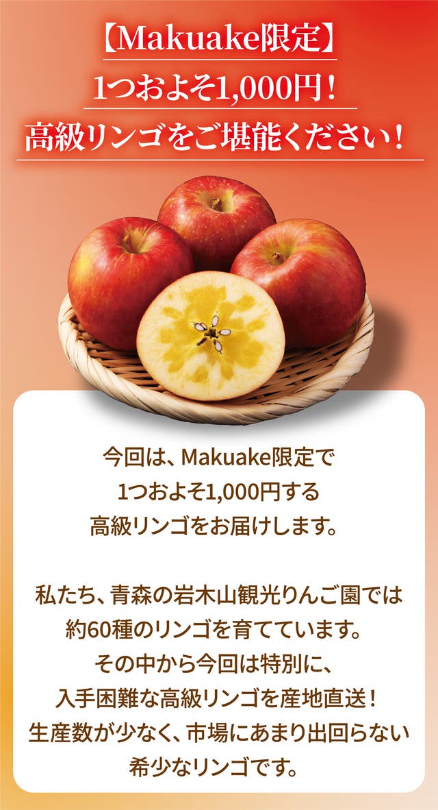 なかなか市場で見かけることのない「1個1,000円の高級リンゴ」と、1Lあたり6個のリンゴを使った贅沢な「プレミアムりんごジュース」をお楽しみください!