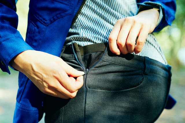 Rinpanは両サイドに、ウエストから広がる秘密の“マチ”がかくれています。ファスナーを下げるとマチが広がり、最大30cmまでウエストサイズの調整が可能です(※実用新案取得済)。