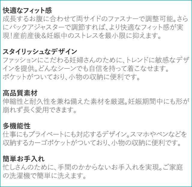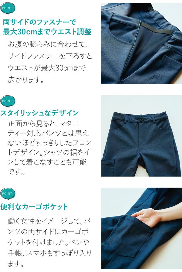 女性の変わる体型にシームレスに寄り添う、快適なフィット感を実現しました。これまでにない、スタイリッシュで機能的なマタニティーワークパンツの誕生です。