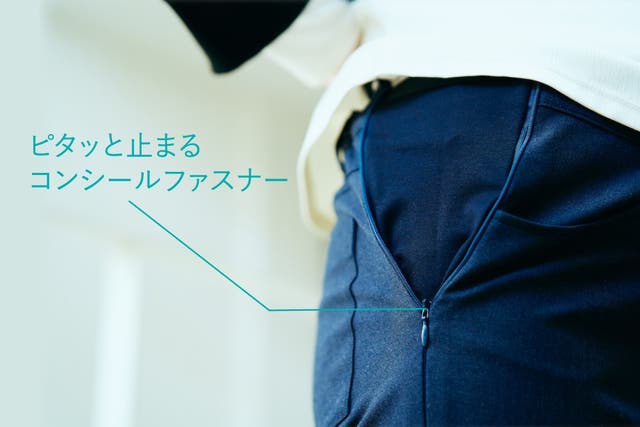 ファスナーは、閉じると目立たないコンシールファスナーを採用。途中で止めても、勝手に引き手が下がることはありません。お腹に合わせて、ちょうどいい位置までサイドのファスナーを開け、自由に調整することができます。