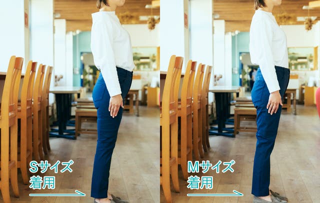 パンツの種類はストレートのスキニータイプで、サイズはSとMの2タイプです。 スリムなデニムジーンズやパンツスーツを履くときのイメージでサイズをお選びください。ストレッチ性の高い生地を採用していますので、表示のサイズより+1~2㎝大きい方でも履ける場合がございます。
