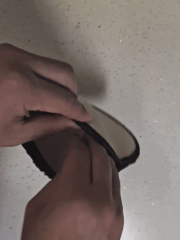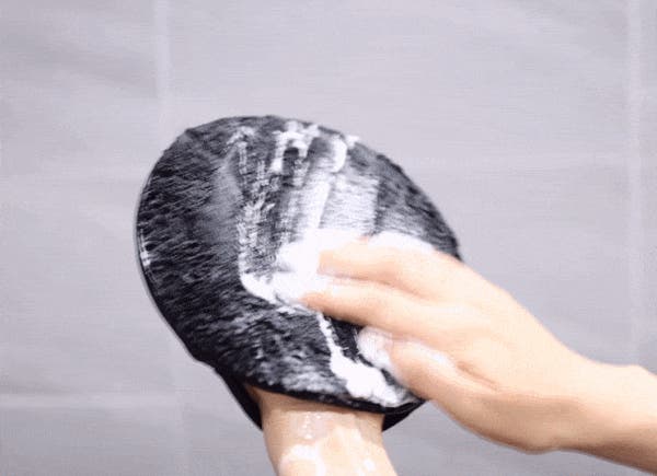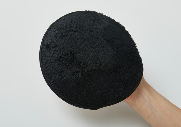 手袋タイプのシャワーパッドに秘められた内部構造を紐解いていきます。ブラックカラーである表面の生地は、フィラメントが組み合わされているマイクロファイバー生地で、触れた瞬間、細やかな筋がやさしく体を包み込みます。