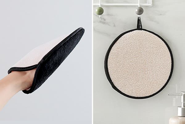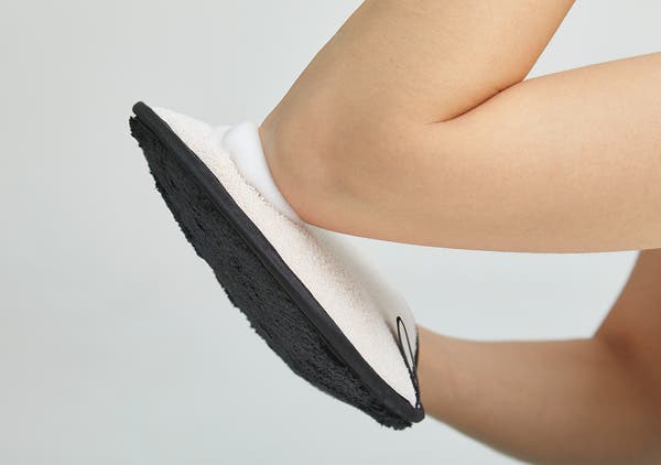 白い裏面はバスコスファイバー生地で角質除去に。無数のくさび形の突起が敏感なお肌を傷つけず、ツヤのあるお肌に生まれ変わります。大ぶりのサイズで顔からつま先まで全身に使えます。