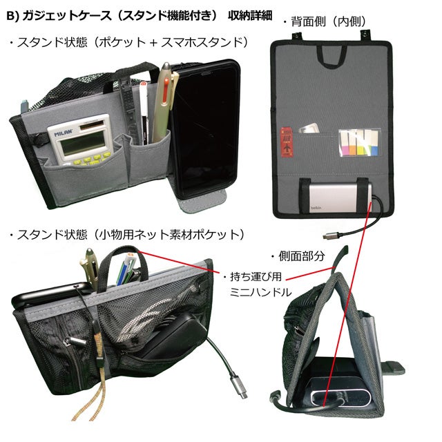 ※付属のB)ガジェットケース、C) タブレットPCスタンドは、メインバッグと同色になります。
