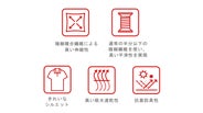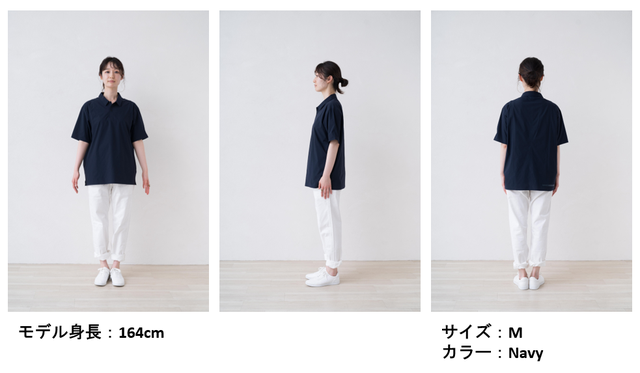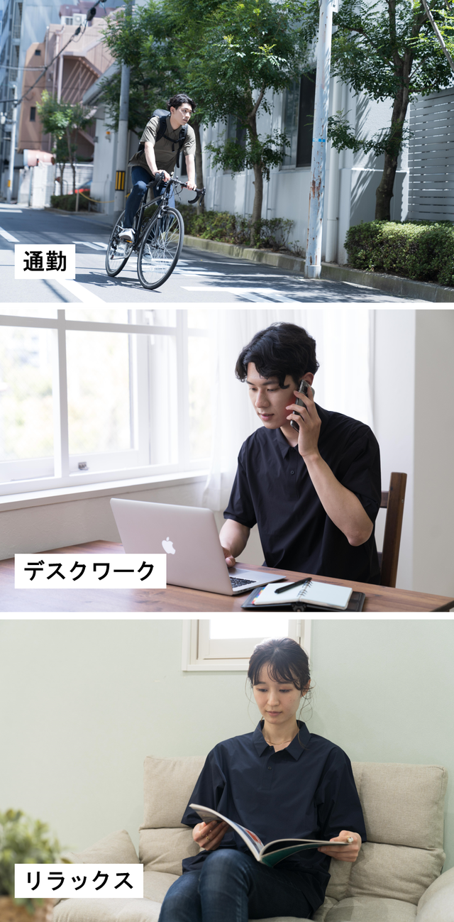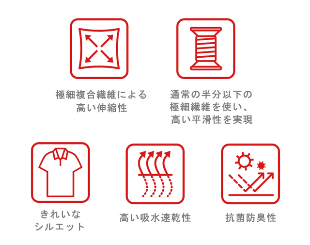 ・一般的なポロシャツ素材より、半分以下の細さの糸を使い、高密度ハイゲージ編み機で編むことにより圧倒的な無抵抗感と無重力感を実現。