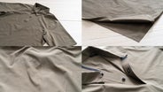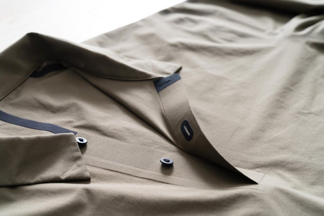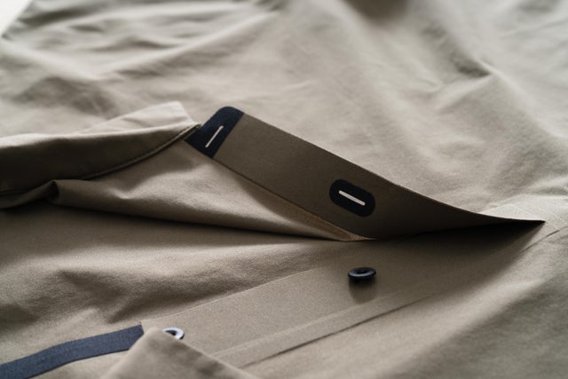 前立て、ボタンホールにまったく縫製を使わず、生地の重ねを極限まで減らす事によって、圧倒的な軽量感と究極のミニマリストシルエットを実現。