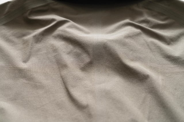 従来縫製手法だと生地と縫い糸が重なる肩部分を、完全無縫製にする事により、肩回りの立体感UP、生地本来のストレッチ性を失わなず、どんなシーンにも対応しうる可動性を実現。