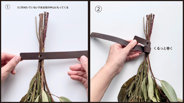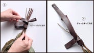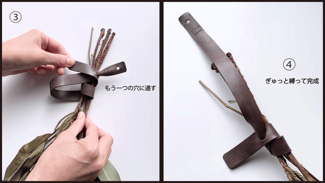 【ご使用方法】枝に革を1〜2回巻きつけて穴に1回通すだけ。