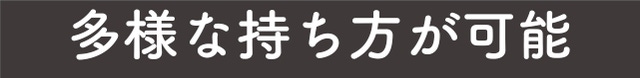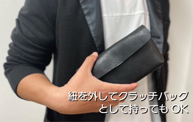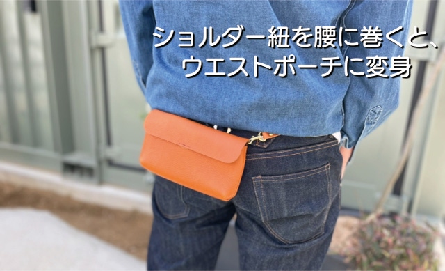 - 斜め掛け、ベルトループ付け、ウエスト掛け、クラッチバッグ、多様な持ち方を楽しめるショルダー紐。