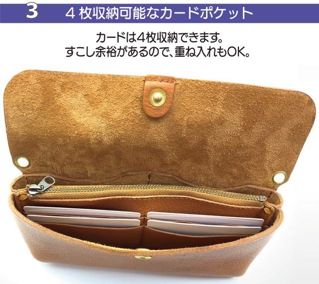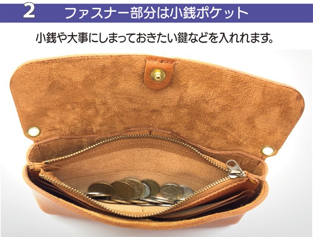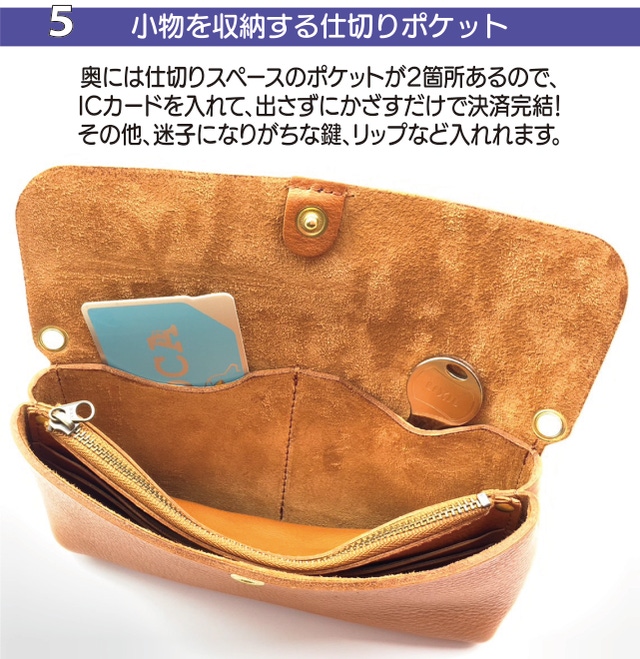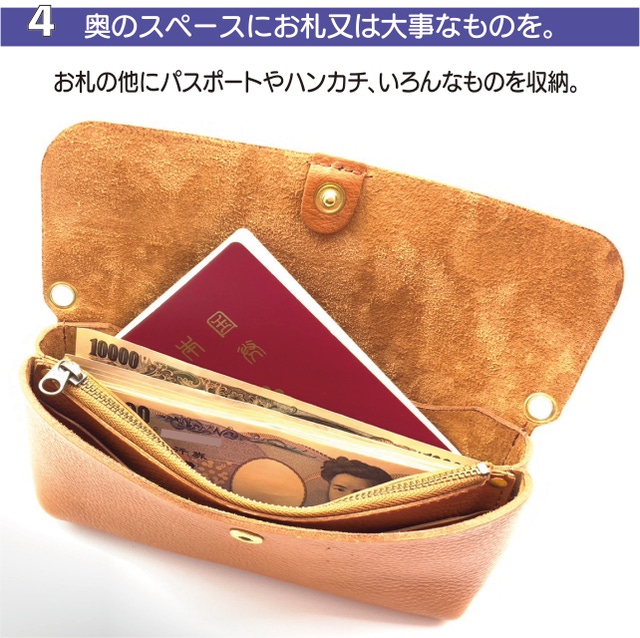 - 便利なポケットで美しく収納。スマホ、カード、紙幣、小銭、鍵、パスポートなど収納可能。