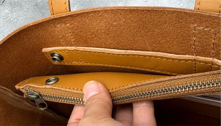 革の裏がみえる作りのトートなので、物を入れた時に革の毛羽が付くのを懸念します。その問題を解決しました。
