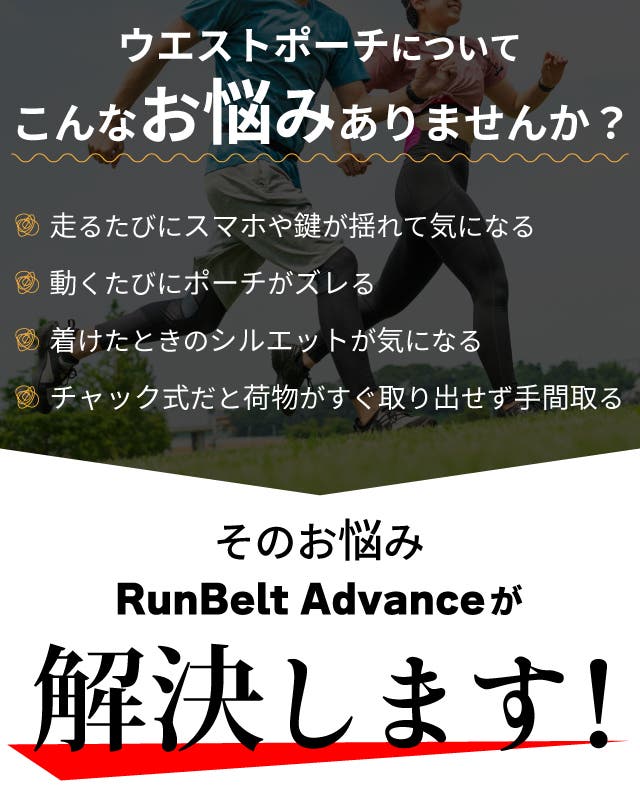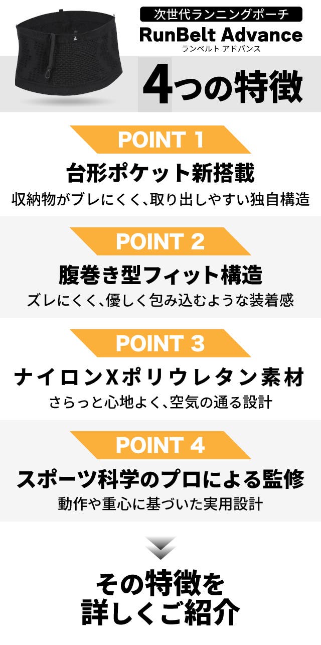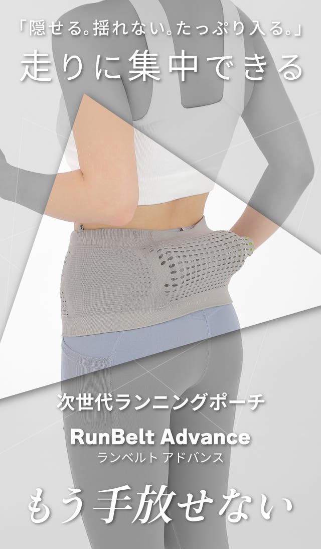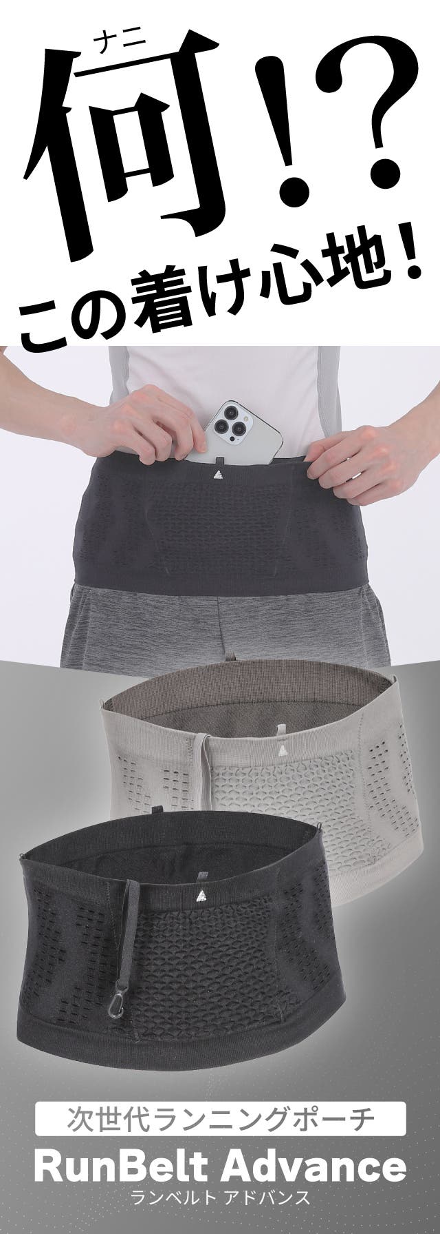 RunBelt Advance(ランベルト アドバンス)は、スマホや鍵、ペットボトルなどが収納できて、走ってもズレない、“着けていることを忘れるほど快適な”腹巻き型ランニングポーチです。