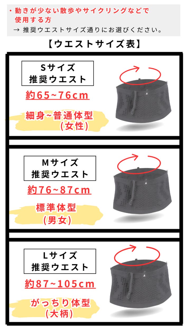 走ってもズレにくく、長時間の装着でも腰への負担が少ないため、運動中に「位置の調整ばかりしてしまう」「締めつけが苦しい」といった悩みを大幅に軽減します。