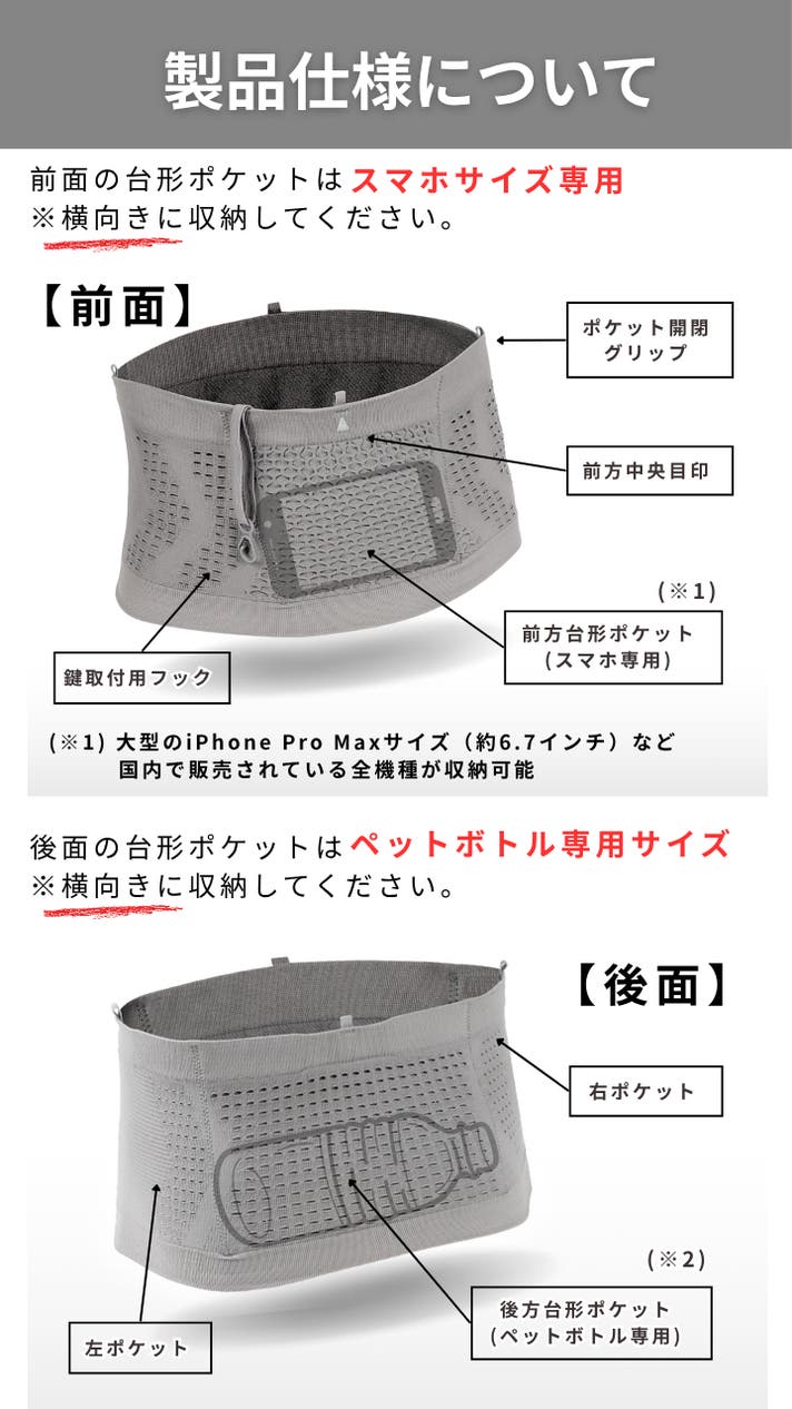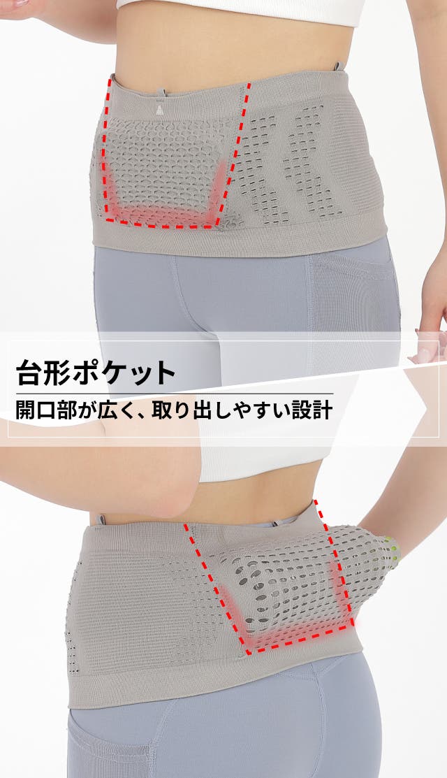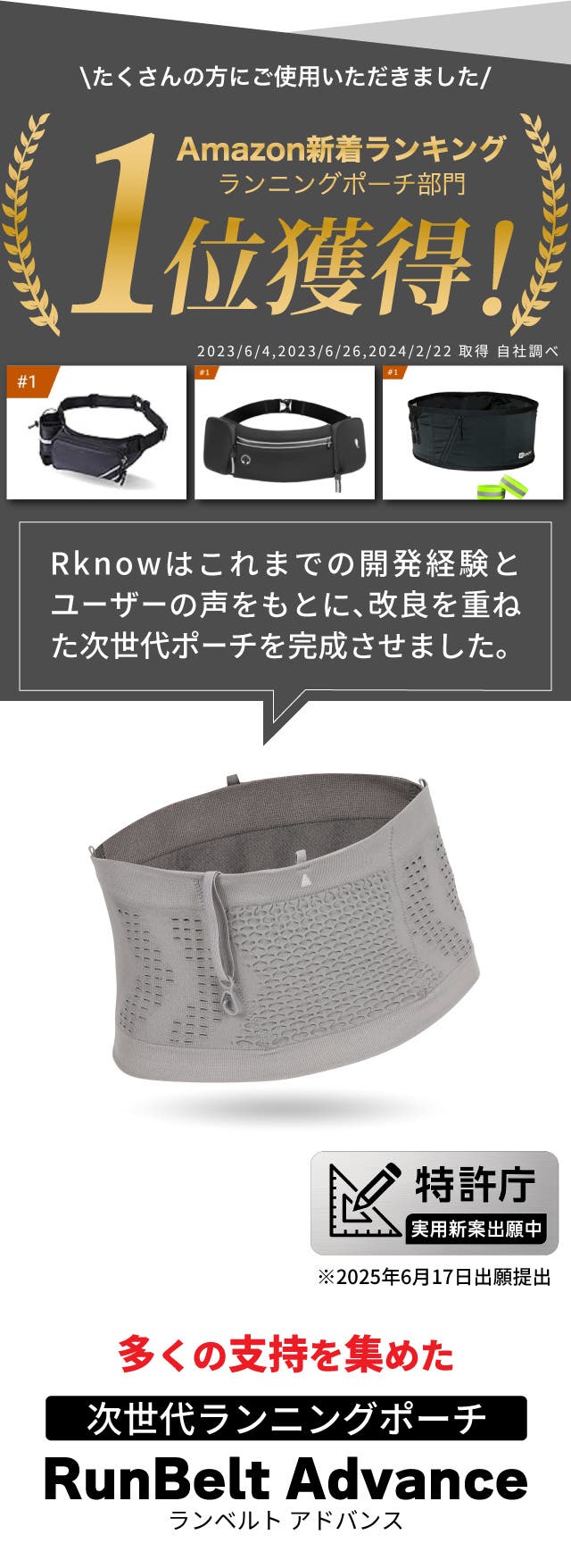 今回の「RunBelt Advance」は、そうした経験と実績をもとに、一から構造設計を見直し、より快適で実用的な腹巻型ランニングポーチとして開発しました。現在、この製品の自社新構造の台形ポケットについては実用新案として出願中です。