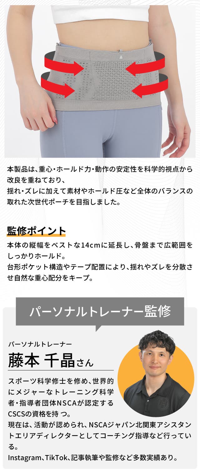 従来のウエストポーチでは、収納物の重さで上下左右に揺れやすく、重いアイテムを入れると、走行中に不快感を覚えることも少なくありませんでした。