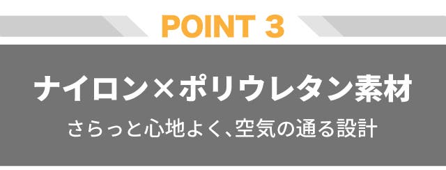 軽量でしなやかなナイロンに、優れた伸縮性をもつポリウレタンを加えることで、動きにしっかりフィットしながらも締めつけ感が少なく、着け心地の良さを実現しています。