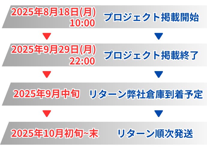 ※弊社倉庫到着予定は、可能な限り前倒しを計画しております。少しでも早いリターン発送に注力させていただきます。