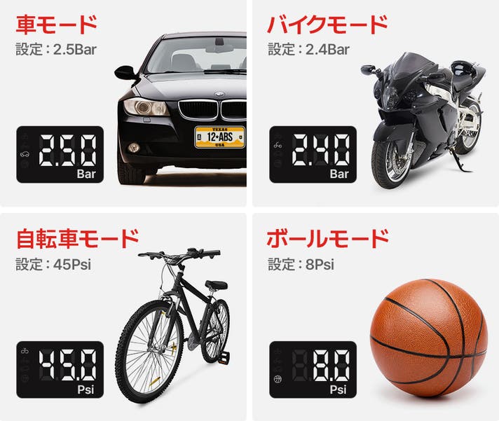 4つのモードから選択するだけで、設定した理想のPSIに達するとタイヤ空気入れが自動で停止。サッカーの試合前のボール準備から、長距離ライドまで。わずか数秒でプロレベルの精度による空気充填が可能です。