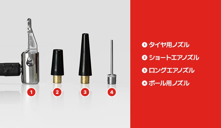 タイヤ用ノズル、ショートエアノズル、ロングエアノズル、ボール用ノズルを含む