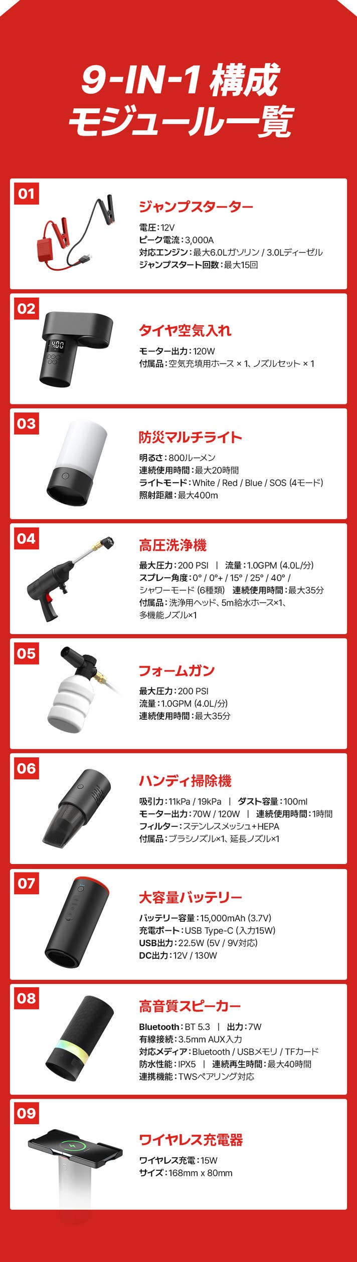 緊急時から日常のドライブまで幅広く対応できるよう、9つのモジュールを備えた