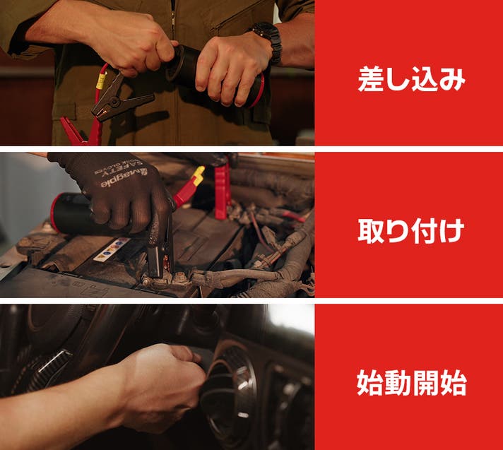 ジャンプスターターの使い方はとても簡単、わずか3ステップで完了です。