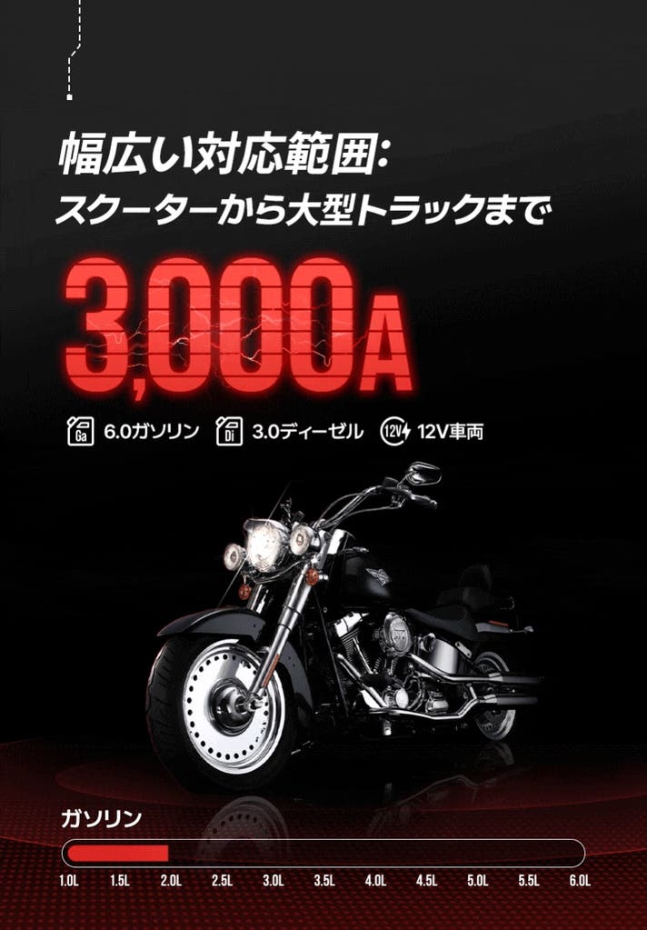 小型車両、SUV、バンはもちろん、大型トラックにも対応し、最大3000Aのピーク電流で最大6.0Lガソリンエンジンまたは3.0Lディーゼルエンジンまでサポートします。
