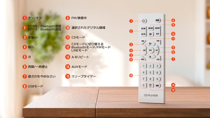 A-Bリピート機能: CDやUSBモードの再生中に、繰り返したい区間の開始点(A)と終了点(B)をリモコンで指定。その区間だけを集中して何度も聴き直すことができます。苦手なフレーズの反復練習に非常に便利です。