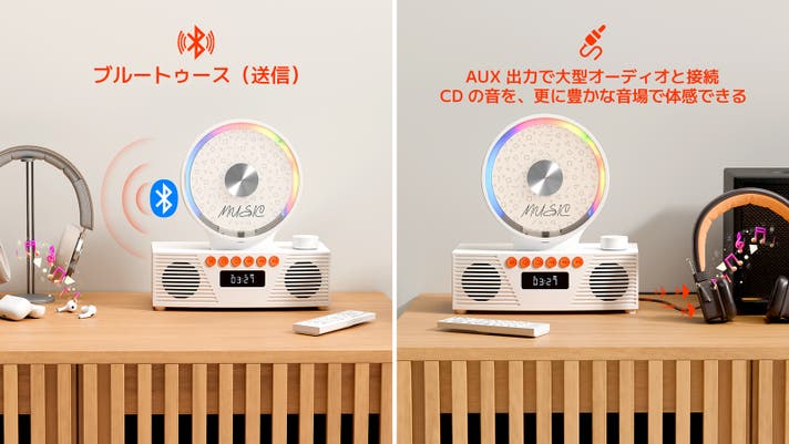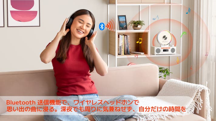 CDやUSBモードで再生中の音楽を、お手持ちのBluetoothイヤホンやヘッドホンへワイヤレス送信できます。深夜の映画鑑賞や、家事をしながらの「ながら聴き」に最適です。