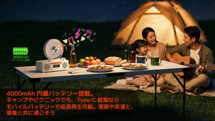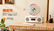 4000mAh電池搭載で、電源コードに縛られることなく、好きな場所で音楽を楽しめます。 フル充電(約5~6時間)で、CDモードで約4時間の連続再生が可能。リビングから寝室への移動はもちろん、テラスやアウトドアへの持ち出しも自由自在です。