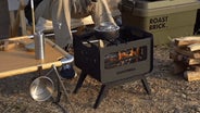 バーベキューのトレイを下ろすと、手軽に焚き火台として使えます。