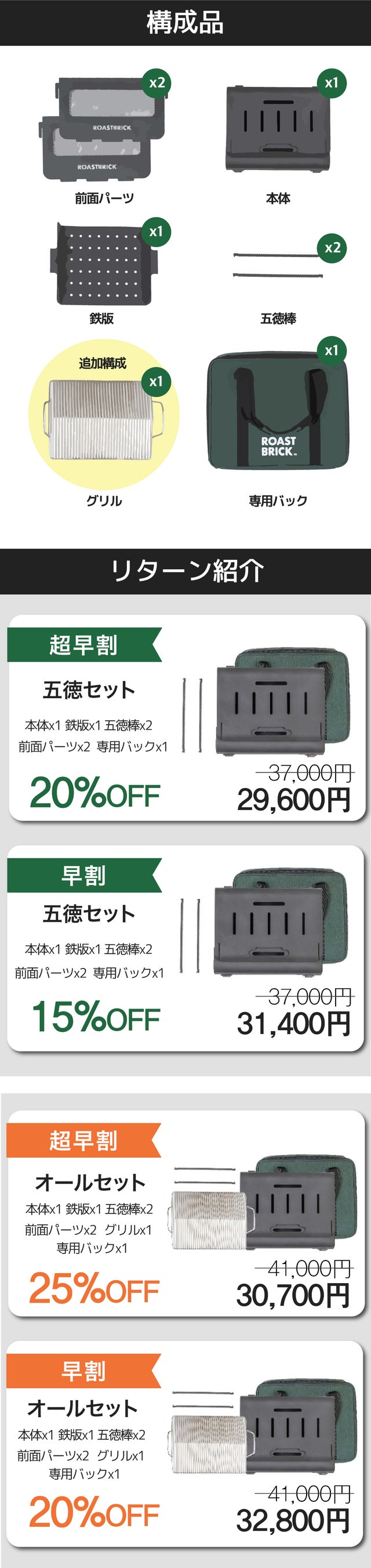 リターン品の配送が完了するまで、弊社はROASTBRICKの日本における独占販売権を有する正規代理店です。詳細に関しては、ページ下部のリスク&チャレンジをご確認ください。