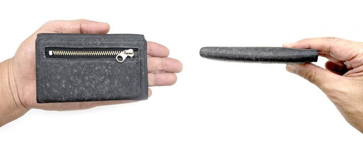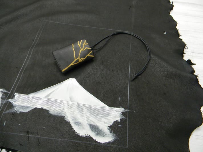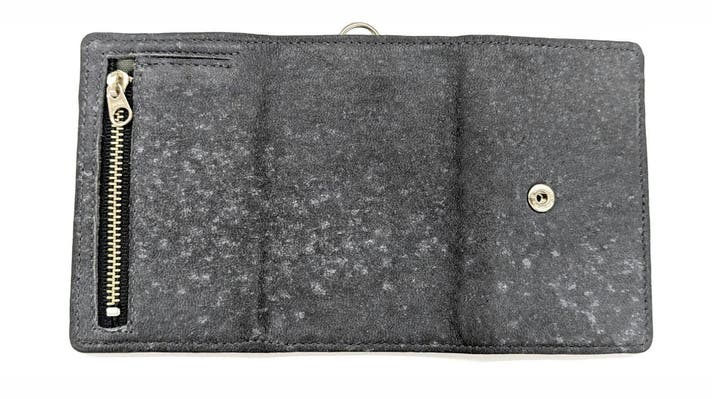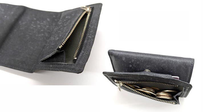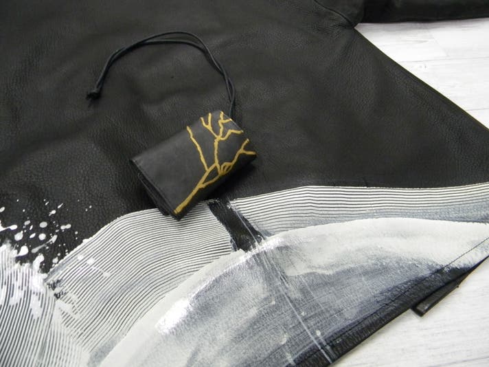 今回ご用意したリターンは「墨染めジビエレザー」に「金継ぎ」を施したミニ財布です。