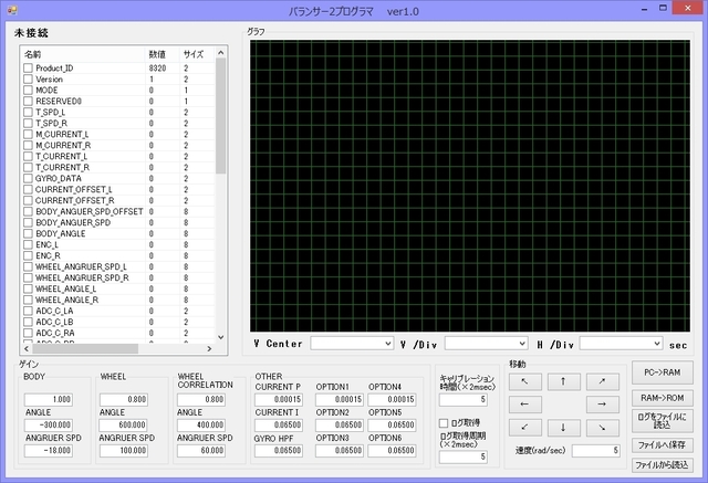 倒立振子の制御プログラムは結構難しいのですが、簡単に内部設定が変えられるソフトを付属しておりゲイン値を変えるだけで動作の特性が変更できます。
