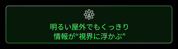 自社史上初、光導波路Greenディスプレイ x Micro-LEDエンジンの組み合わせで、文字や情報が視界の中にふわりと浮かび上がるようなクリアな表示を実現しています。
