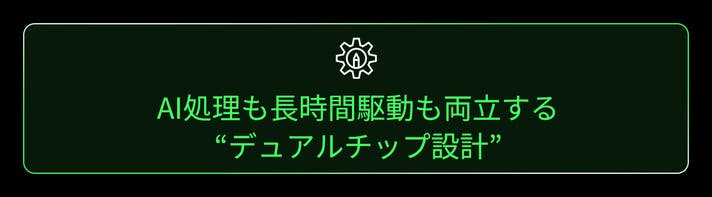 独自のスケジューリングアルゴリズムにより、映像解析・音声認識・翻訳・AIアシストといった負荷の高い処理を軽快にこなしつつ、1日使えるバッテリー駆動を両立できます。