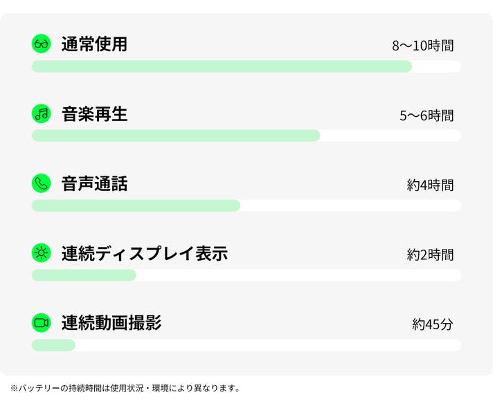 オプションでご用意している10回以上の追加充電ができる充電ケースや、着用しながらでも充電できるカプセル充電器を使えば、映像撮影や翻訳など長時間の利用でも途切れず、長期の旅行や外出でも長く使えます。