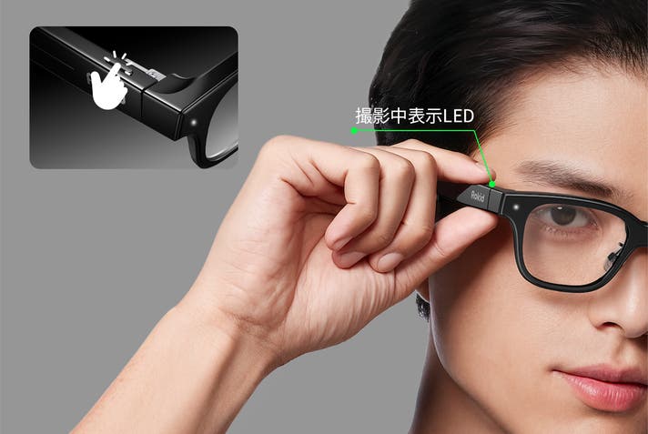 撮影を開始するとフレーム角部のLEDが点灯し、周囲からも撮影中であることが一目で分かり、隠し撮りと誤解されるリスクを抑えています。