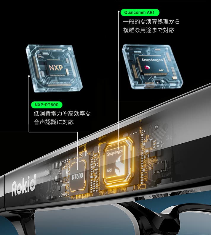 Qualcomm AR1 と NXP RT600 のデュアルチップを搭載し、2つのプロセッサが連携することで、高度なAI処理をスムーズに実行しながら、電力消費を抑える設計。