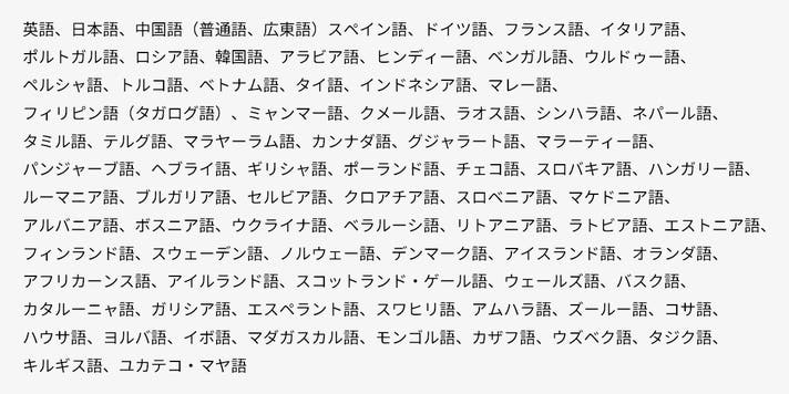 現時点では、英語、日本語、フランス語、ドイツ語、イタリア語、韓国語、ロシア語、スペイン語、簡体字中国語、広東語の計10言語をサポートしています。